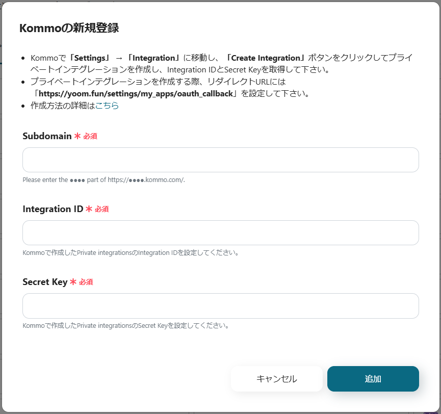 まずGoogle スプレッドシートとKommoをYoomに連携するために、マイアプリに登録します。