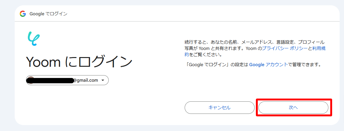 その後、Googleアカウントの選択をして「Yoomにログイン」の画面に進んだら「次へ」をクリックしましょう。