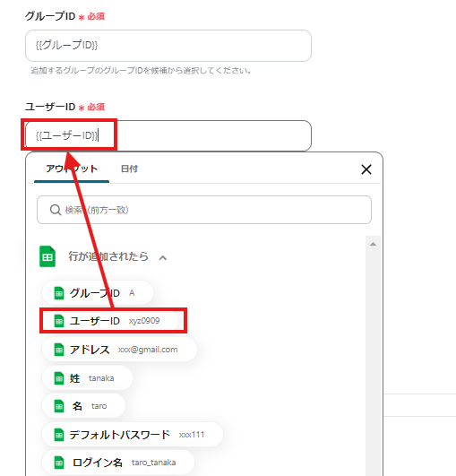 アウトプット(取得した値)された情報を活用して、「グループID」と「ユーザーID」を入力しましょう。