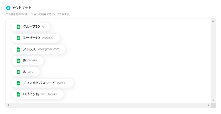テストが成功すると、指定したGoogle スプレッドシートの項目がアウトプット(取得した値)として反映されます。