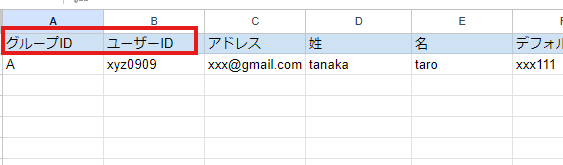 以下の項目はステップ2のグループにユーザーを追加する際に必要な情報です。下記画像のように、あらかじめGoogle スプレッドシート内に情報を格納してください。