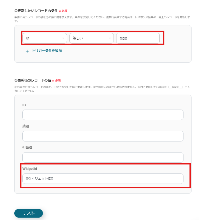 必要な欄の入力が完了したら「テストする」でエラーを確認しましょう。エラーが出ている場合は内容に沿って修正をします。