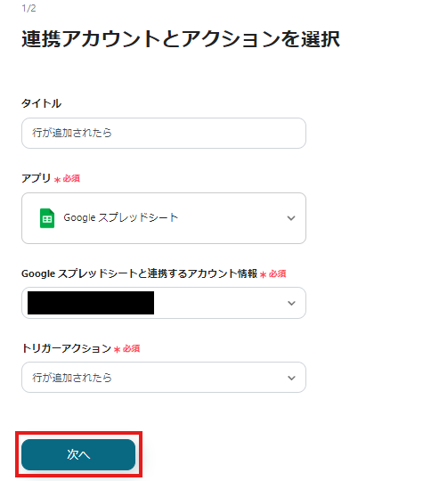最初のページでは、ステップ1のトリガー設定と同様に適切なアカウント情報か確認をして「次へ」をクリックしてください。