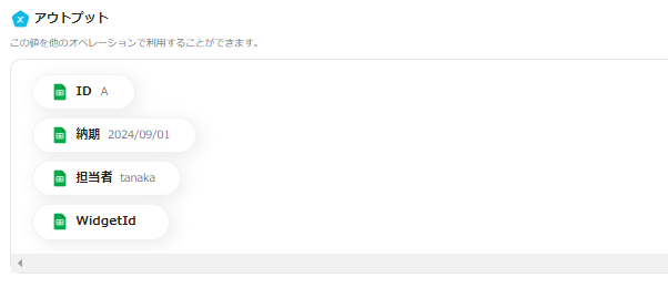 テストが成功すると、指定したGoogle スプレッドシートの項目がアウトプットとして反映されます。