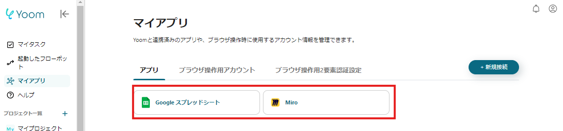 テンプレートをコピーしたら、まずは事前準備として、Yoomの「マイアプリ」からGoogle スプレッドシートとMiroのアプリを登録する必要があります。
