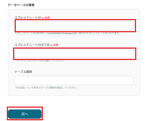 その後、データベース連携の項目にレコードを更新するためのGoogle スプレッドシートの情報を入力し、「次へ」をクリックします。