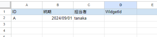 例えば、上記画像のように設定をした場合、スプレッドシートに新しく追加された行の「WidgetId」という列に、自動作成された付箋のIDが自動で入力されるような動きになります。