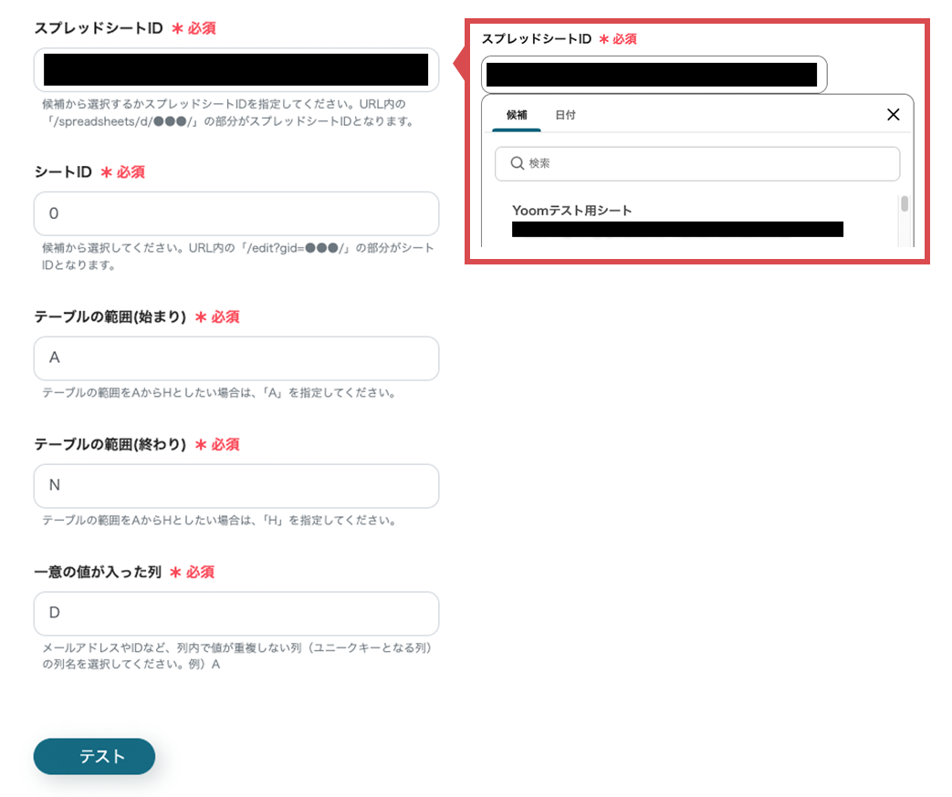 「スプレッドシートID」、「シートID」の項目は、入力バーをクリックすると以下の画面のようにアカウントから取得した情報を「候補」として展開できます。