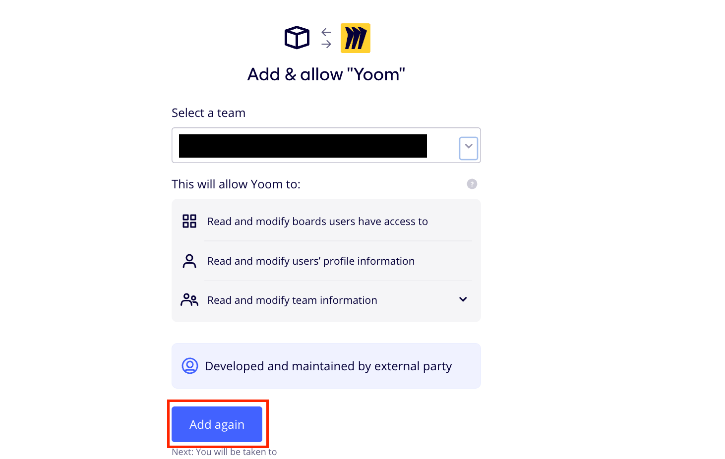 アプリアイコンクリック後、Yoomを追加するかの認証画面に移行するので、アカウントに基づくTeamの情報を選択して[Add again]をクリックします。