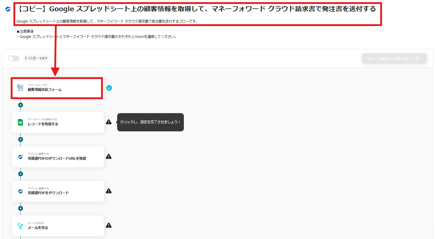 フォームで顧客情報を検索し、Google スプレッドシートのデータを基に発注書を作成し、メールを送信する自動化を活用すれば細かい設定が不要になります。