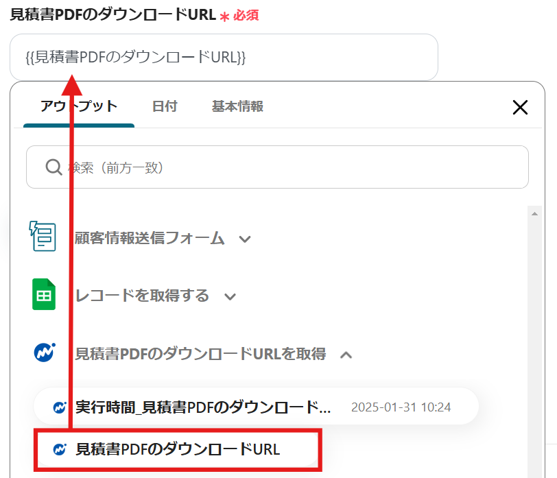 「見積書PDFのダウンロードURLを取得」のアウトプットから選択しましょう。