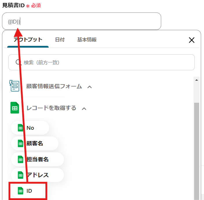 スクロールし、「見積書ID」を設定しましょう。