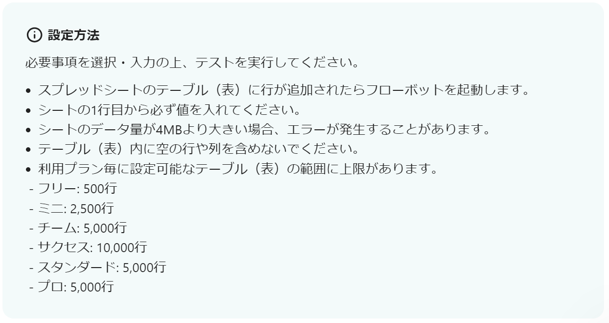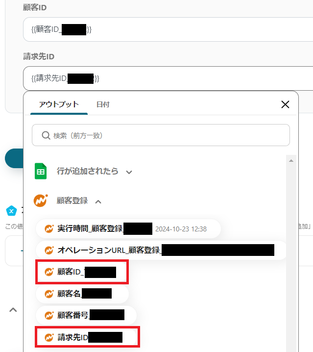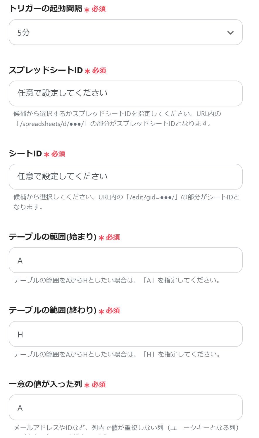 以下の画面が表示されたら、「行が追加されたら」のアウトプットを使用して、必須項目の設定をします。