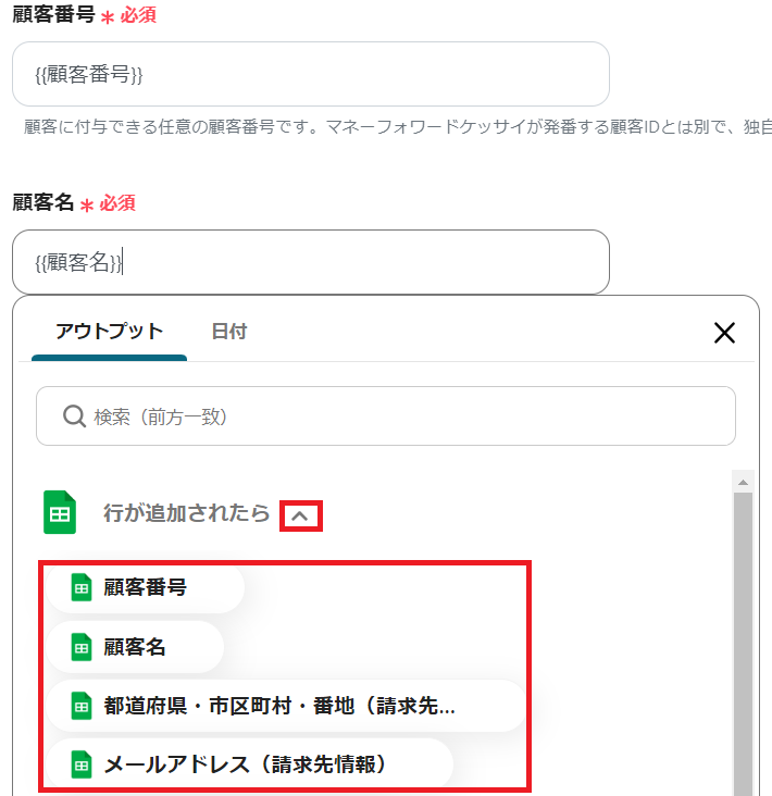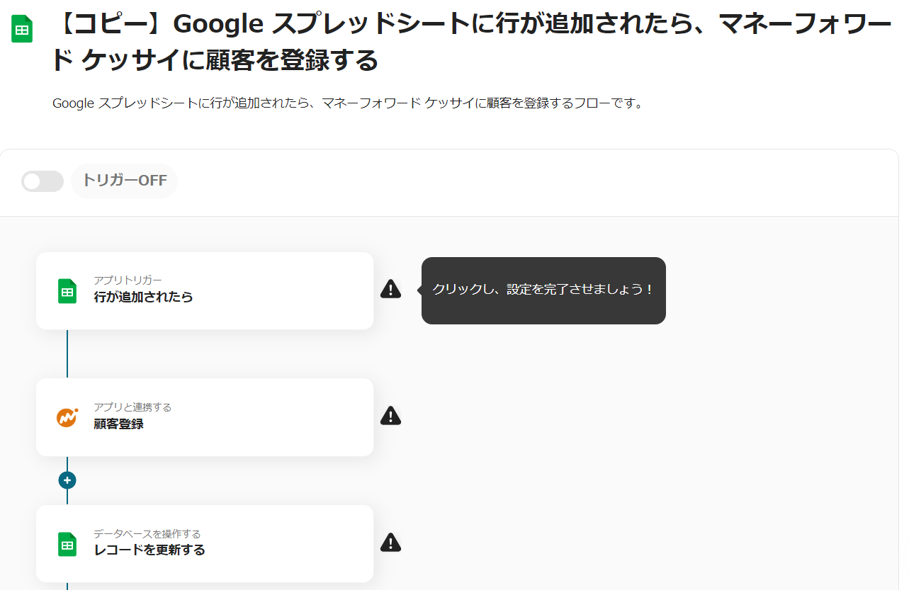 Google スプレッドシートに行が追加されたら、マネーフォワード 掛け払いに顧客を登録するフローです。