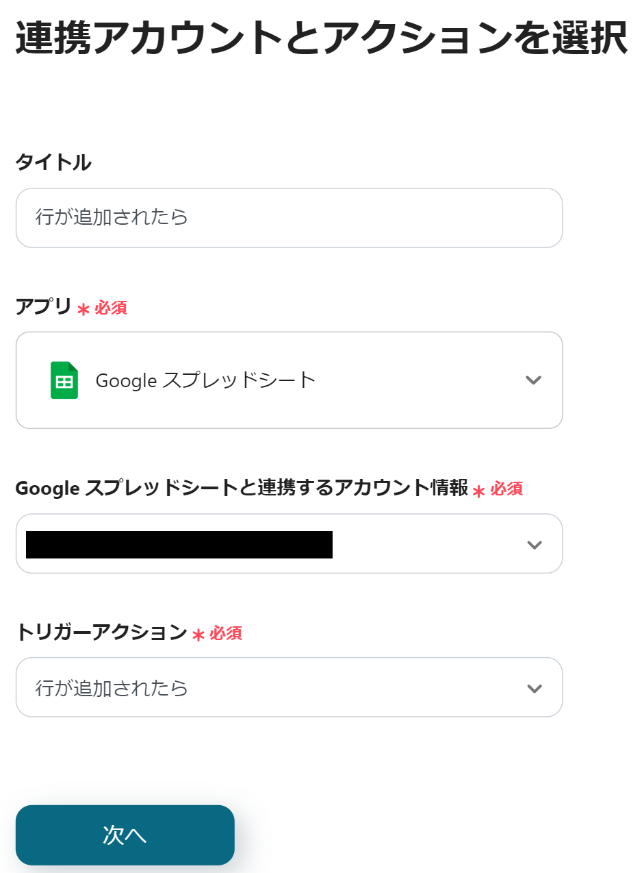 最初にGoogle スプレッドシートの設定を行うため、「行が追加されたら」をクリックしてください。
