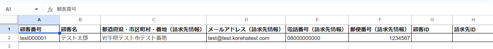 Google スプレッドシートに移動し、顧客情報をテスト用に設定します。