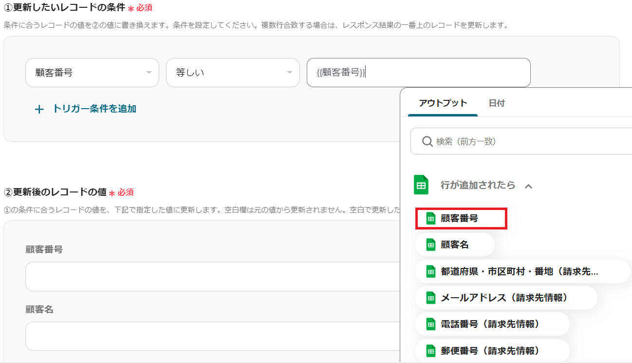 以下の画面が表示されたら、「更新したいレコードの条件」を設定しましょう。