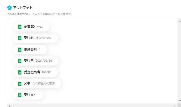 テストが成功すると、指定したGoogle スプレッドシートの項目がアウトプットとして反映されます。