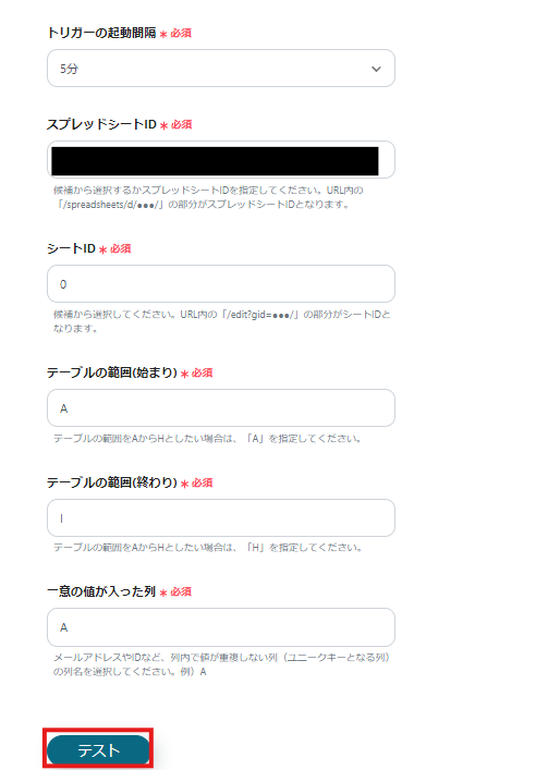 すべての項目が入力できたら「テスト」をクリックして、エラーの有無を確認しましょう。※トリガーの起動間隔については、ご契約されているプランごとに指定できる時間が異なります。詳細は こちら をご覧ください。