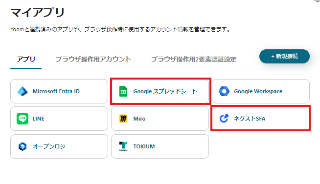 ・Google スプレッドシート、ネクストSFAのそれぞれとYoomを連携してください。