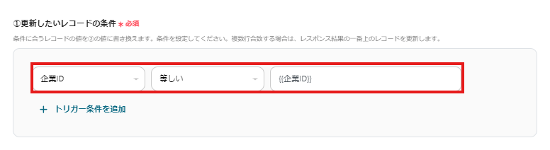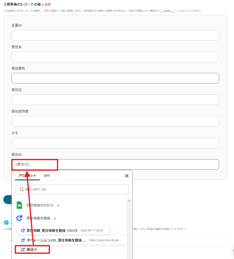 次のページでは、更新したいレコードの条件と更新後のレコードの値を設定します。 例えば、以下のように設定すると、ネクストSFAからアウトプットされた受注IDが、Google スプレッドシートで新しく追加された行の「受注ID」列に自動反映される動きになります。