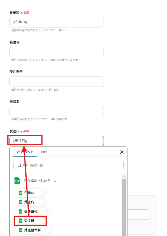 2ページ目では、受注情報を登録するための設定をします。 「企業ID」「受注日」「受注担当者」の3つは、必須の入力項目です。アウトプットされた情報を活用して入力してください。 他の項目については、任意で入力できるので必要に応じて入力しましょう。