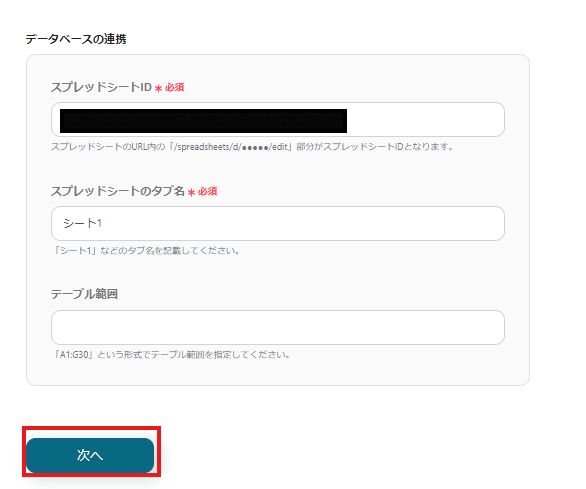 その下には、データベースと連携する設定項目があります。 スプレッドシートIDとタブ名を入力したら、「次へ」をクリックしましょう。