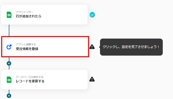 はじめに、Google スプレッドシートとネクストSFAをYoomと連携します 次に、トリガーでGoogle スプレッドシートを選択し、「行が追加されたら」というアクションを設定します 次に、オペレーションでネクストSFAを選択し、「受注情報を登録」のアクションを設定します 最後に、オペレーションで再度Google スプレッドシートを選択し、「レコードを更新する」アクションを設定し、処理が完了したことをシートに記録します ※「トリガー」:フロー起動のきっかけとなるアクション、「オペレーション」:トリガー起動後、フロー内で処理を行うアクション■このワークフローのカスタムポイント