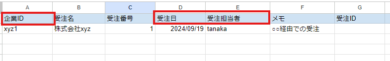 以下の3項目はステップ2で受注情報を登録する際に必要な情報です。下記画像のように、あらかじめGoogle スプレッドシート内に情報を格納してください。