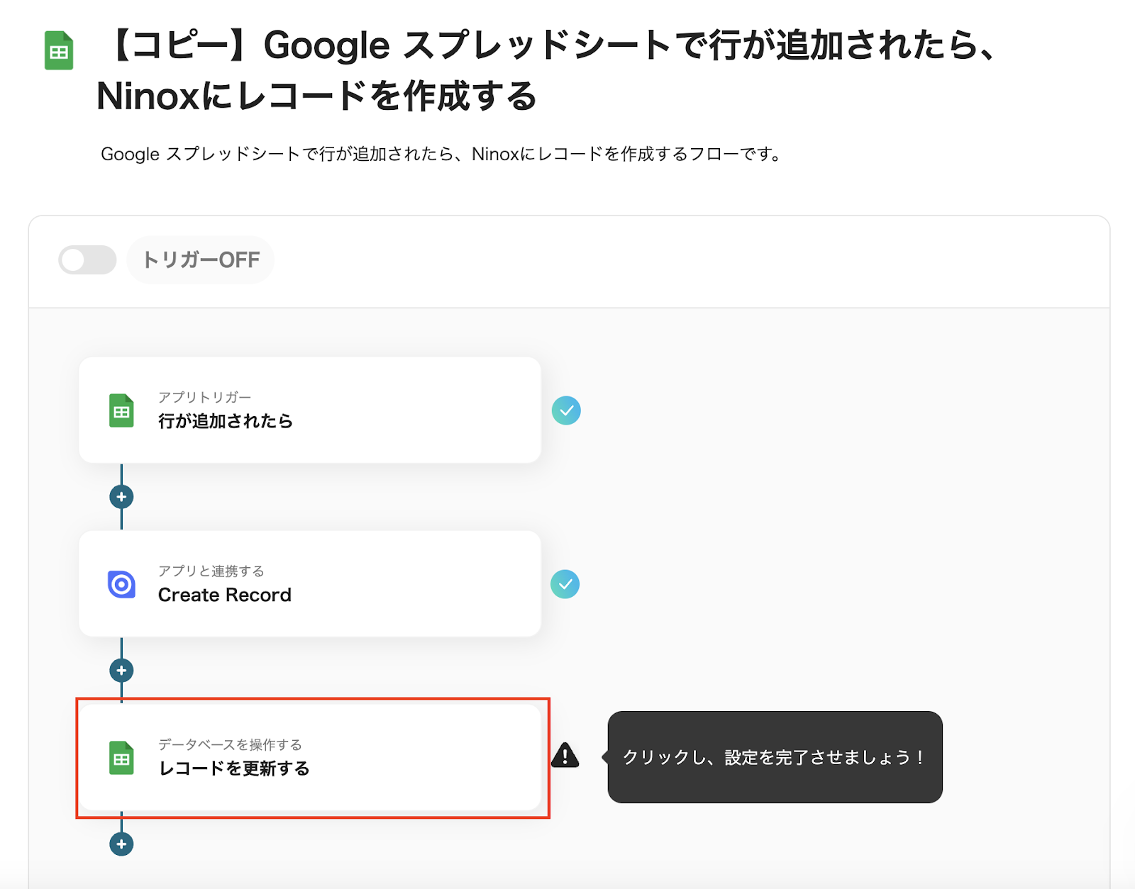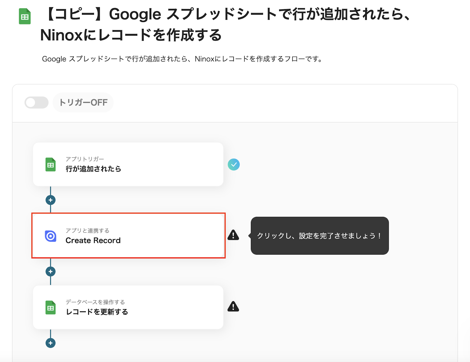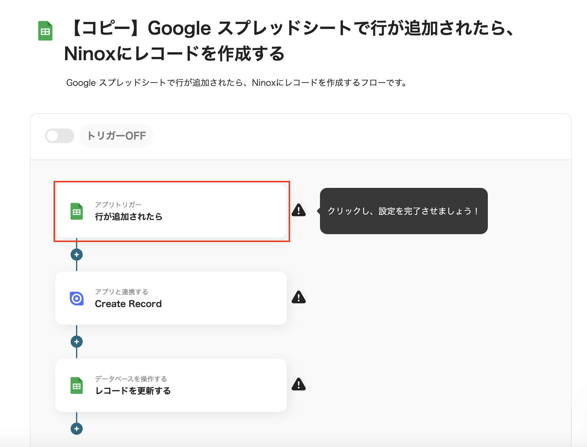 Google スプレッドシートに行が追加されるだけで、Ninoxへのレコード作成が自動的に実行されるフローです。