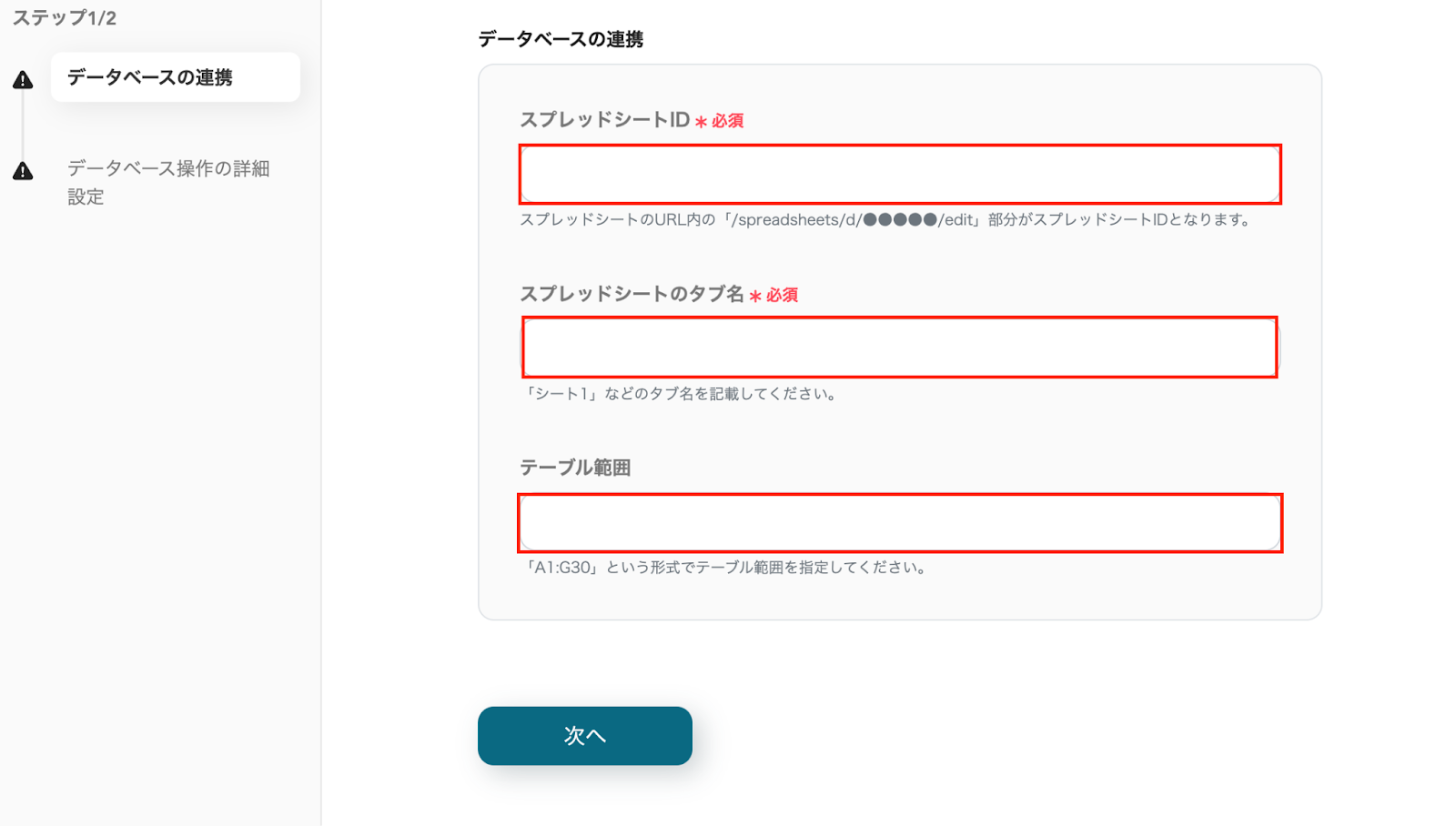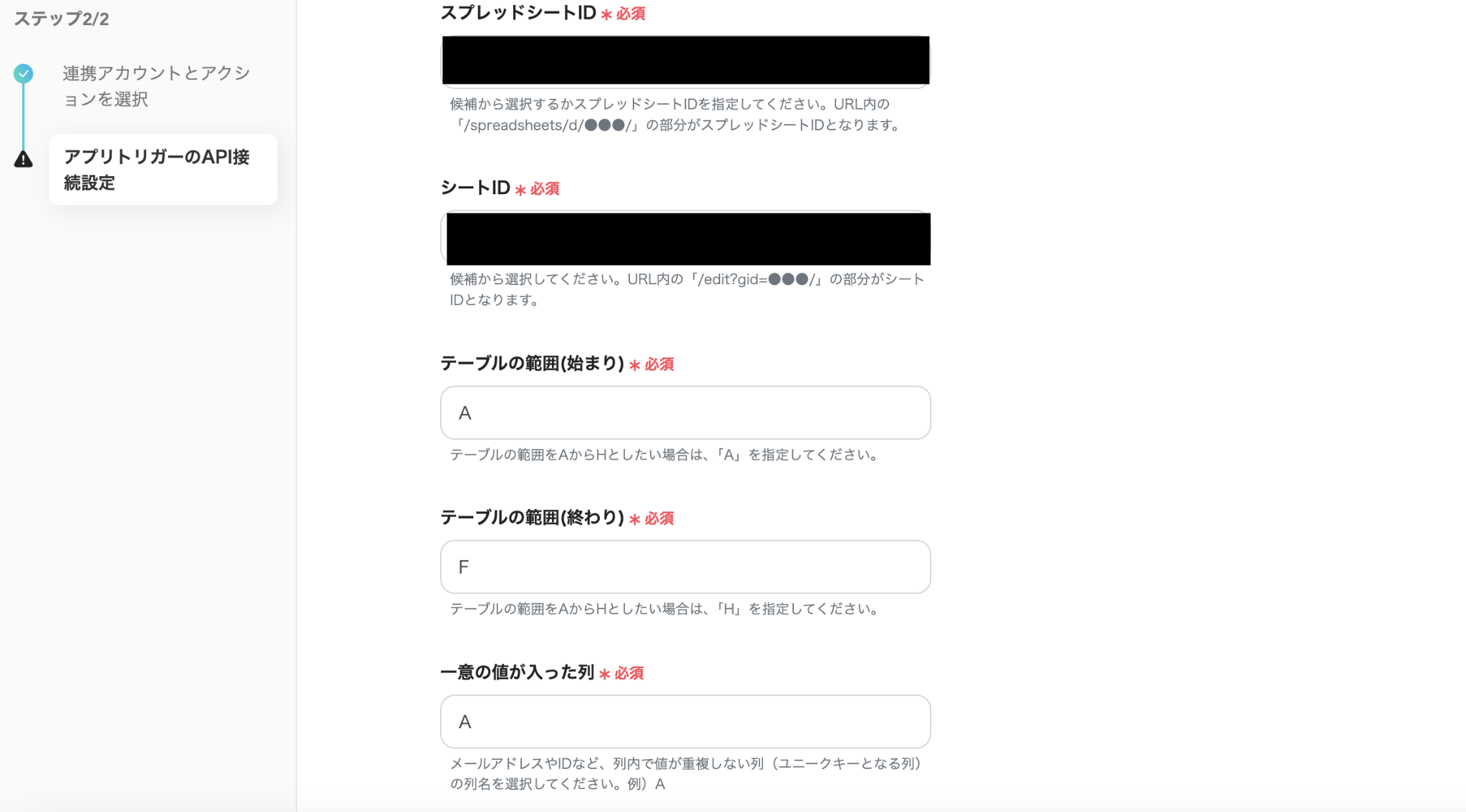 「スプレッドシートID」「スプレッドシートのタブ名」:入力欄をクリックして表示される候補から選択