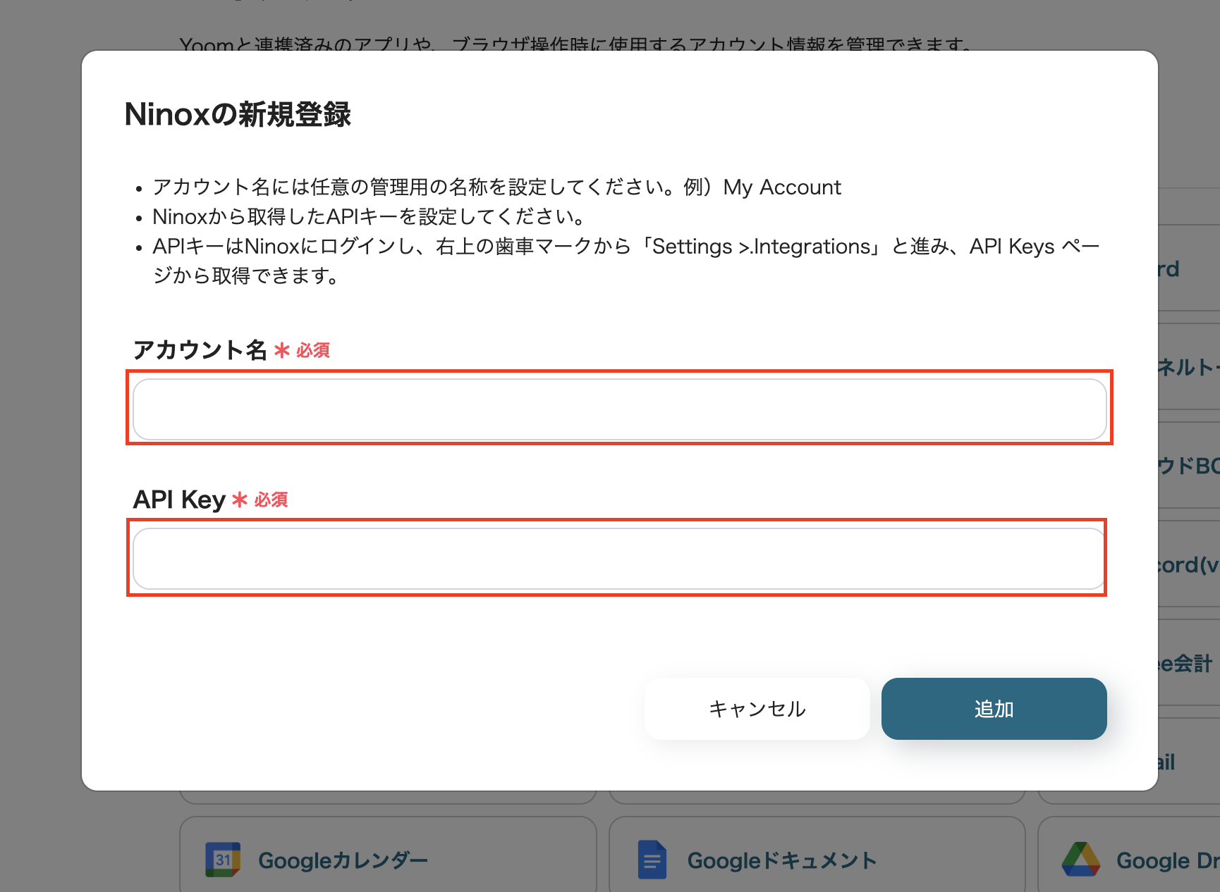 アカウント名とAPI Keyを注意事項を確認しながら入力しましょう。