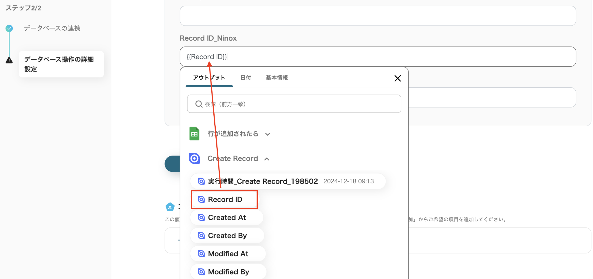 「Record ID_Ninox」の項目に、Google スプレッドシートに対応するNinoxのレコードが分かるようにNinoxのレコードIDのアウトプット(取得した値)を入力します。