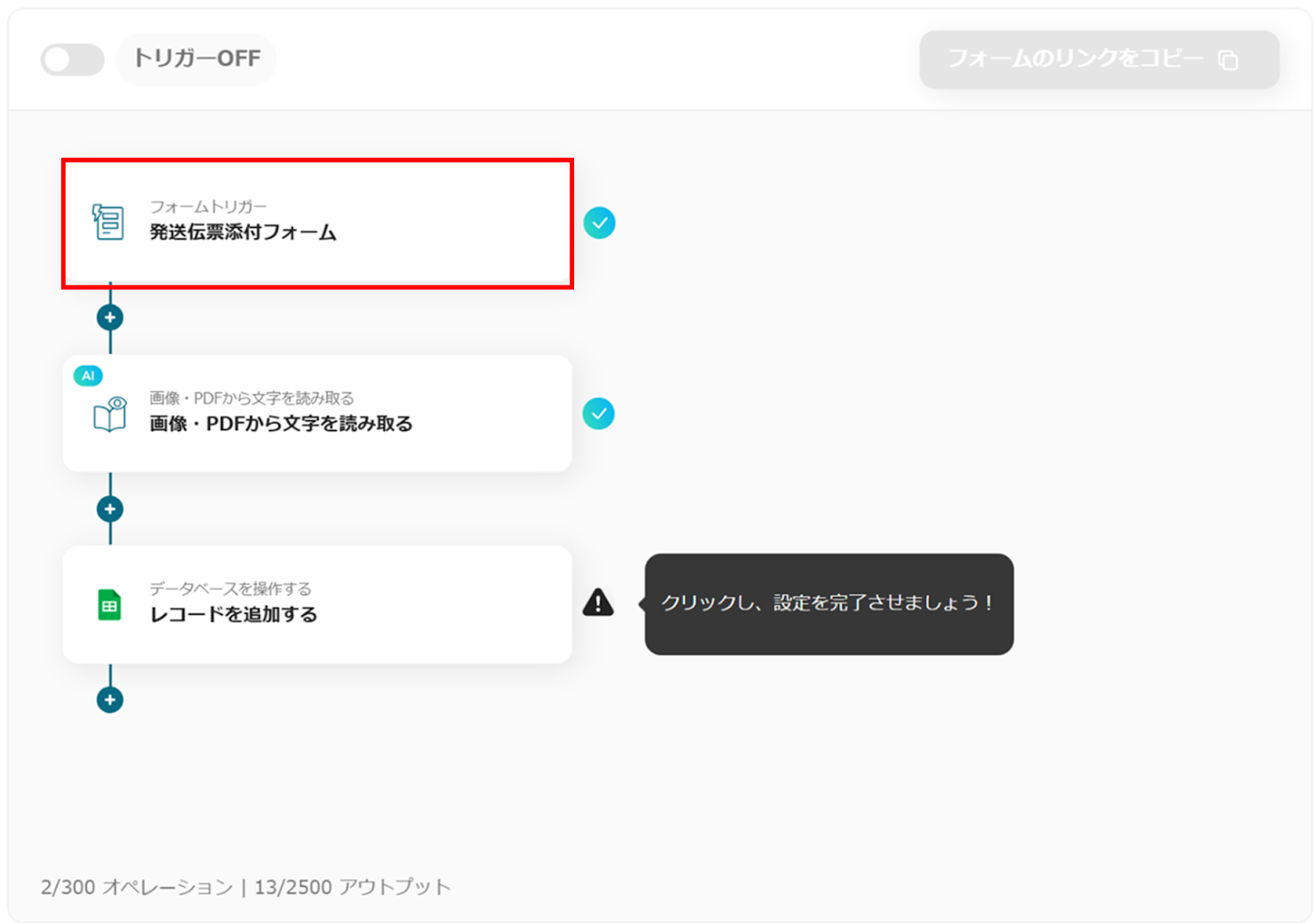 フォームトリガーの「発送伝票添付フォーム」をクリックします。