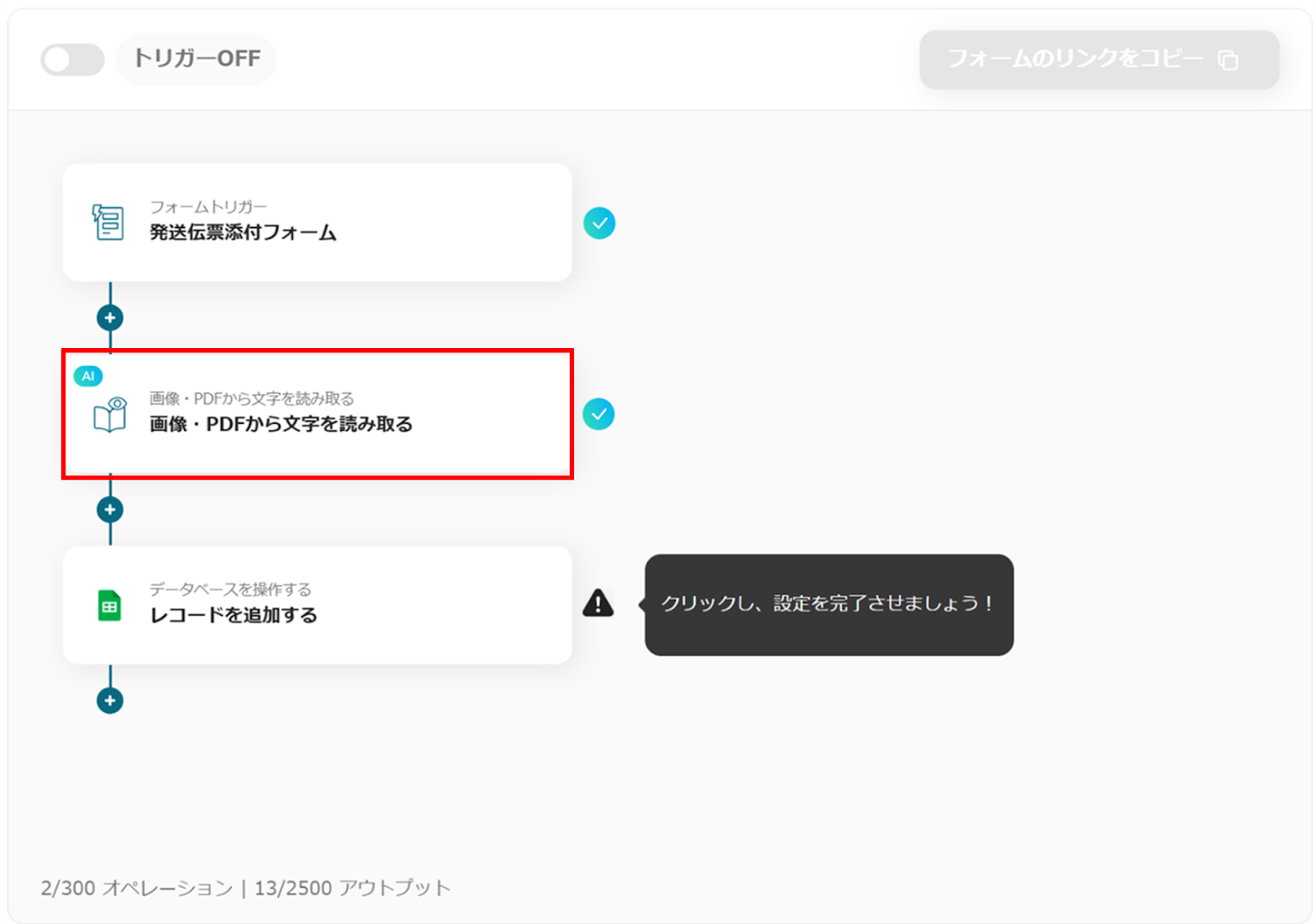※OCRまたは音声を文字起こしするAIオペレーションはチームプラン・サクセスプランでのみご利用いただける機能となっております。フリープラン・ミニプランの場合は設定しているフローボットのオペレーションはエラーとなりますので、ご注意ください。チームプランやサクセスプランなどの有料プランは、2週間の無料トライアルを行うことが可能です。無料トライアル中には制限対象のアプリやAI機能(オペレーション)を使用することができます。