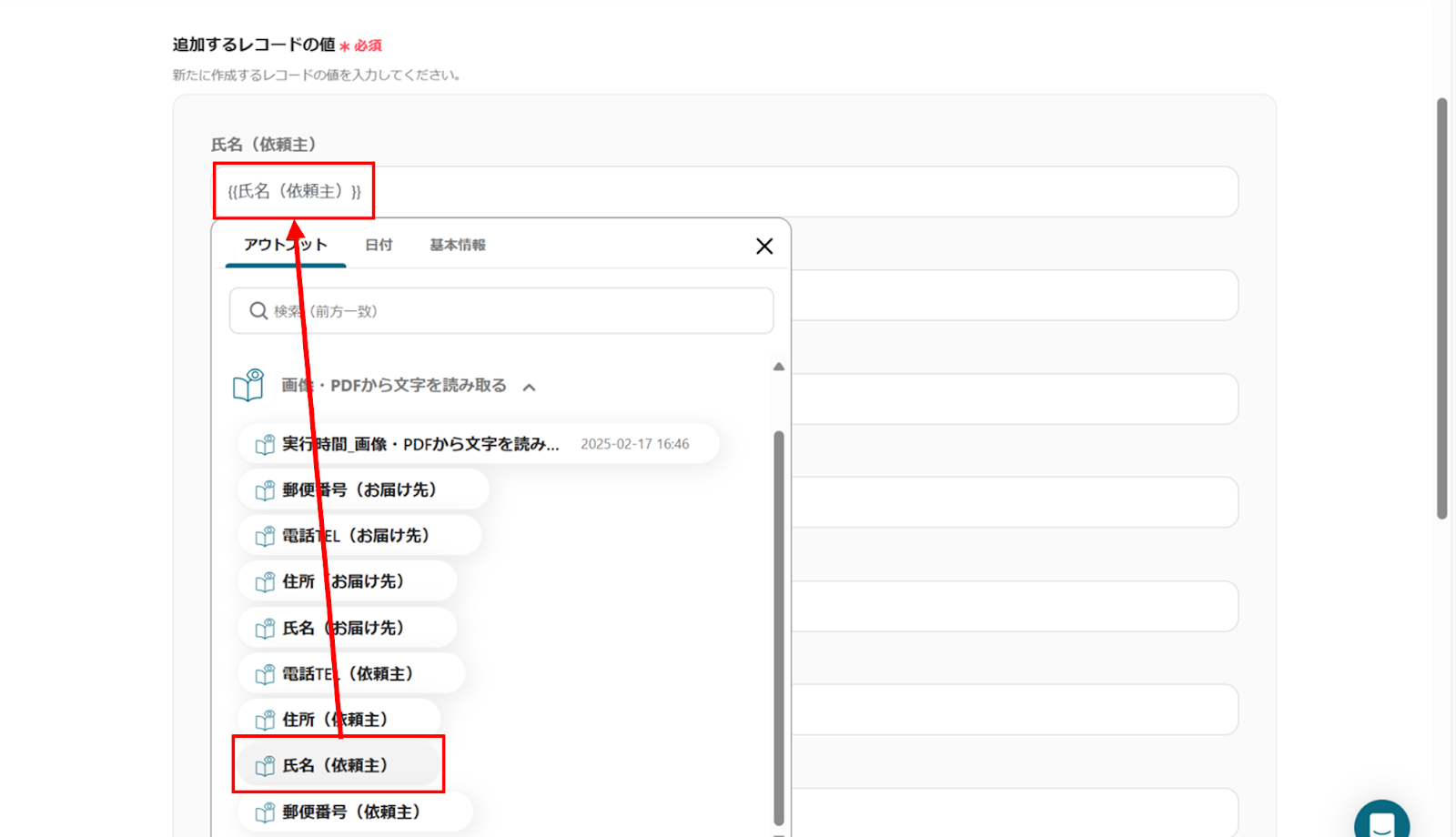 (3)「データベース操作の詳細設定」画面から、追加するレコードの値をアウトプットを使って入力します。
