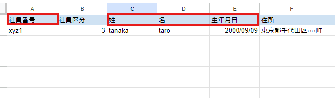 以下の項目はステップ2の従業員台帳を更新する際に必要な情報です。下記画像のように、あらかじめGoogle スプレッドシート内に情報を格納してください。