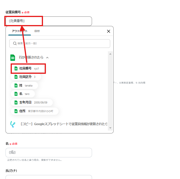 「従業員ID」「氏名」「生年月日」は必須の入力項目です。アウトプットされた情報を使用し、入力しましょう。