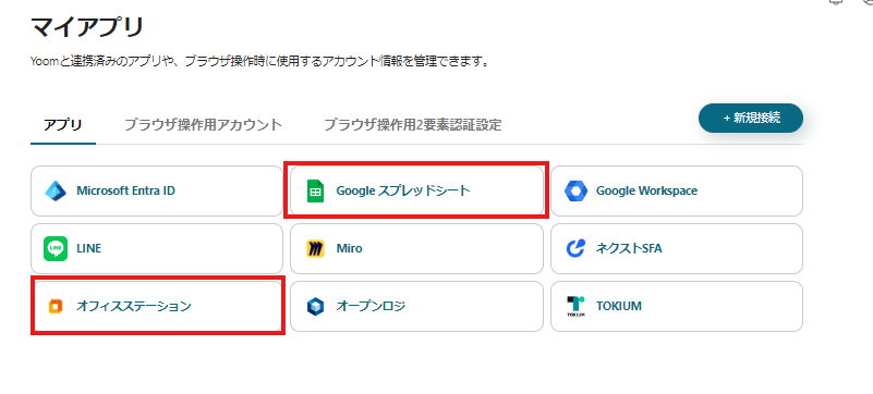 ・Google スプレッドシート、オフィスステーションのそれぞれとYoomを連携してください。