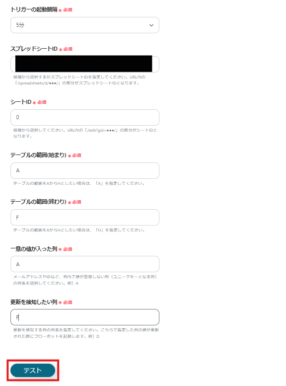 すべての項目が入力できたら「テスト」をクリックして、エラーの有無を確認しましょう。