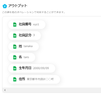 テストが成功すると、指定したGoogle スプレッドシートの項目がアウトプットに反映されます。
