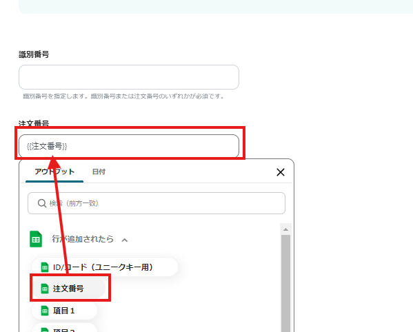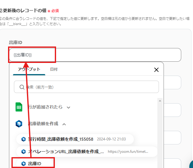 例えば、以下のように設定すると、オープンロジからアウトプットされた出庫IDの値が、Googleスプレッドシートに新しく追加された行の「出庫ID」という列に自動で反映されます。