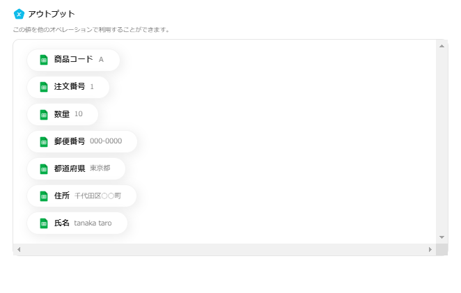 テストが成功すると、指定したGoogleスプレッドシートの項目がアウトプットとして反映されます。