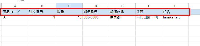 以下7つの項目はステップ2の出庫依頼を作成する際に必要な情報です。下記画像のように、あらかじめGoogleスプレッドシート内に情報を格納してください。