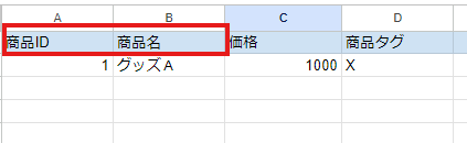 「商品ID」と「商品名」の項目はステップ2の商品を更新する際に、必ず必要になります。そのため、以下の画像のようにあらかじめ2つの情報をGoogleスプレッドシートに格納しておきましょう。
