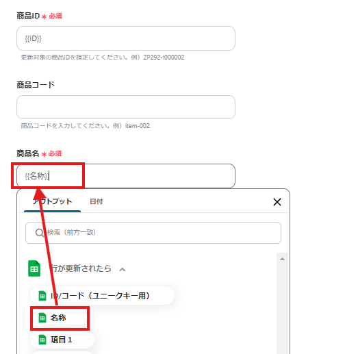 「商品ID」と「商品名」は必須の入力項目なので、アウトプットされた情報を活用して入力してください。