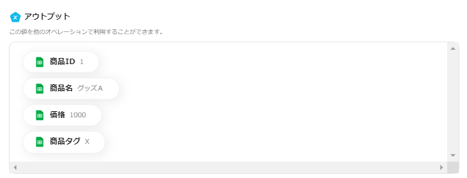 テストが成功すると、指定したGoogleスプレッドシートの項目がアウトプットとして反映されます。
