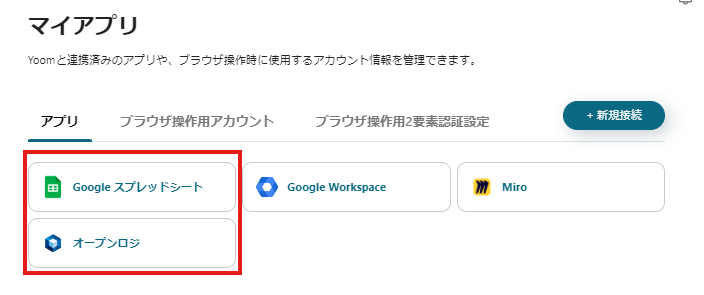 テンプレートをコピーしたら、まずは事前準備として、Yoomの「マイアプリ」からGoogleスプレッドシートとオープンロジを登録する必要があります。
