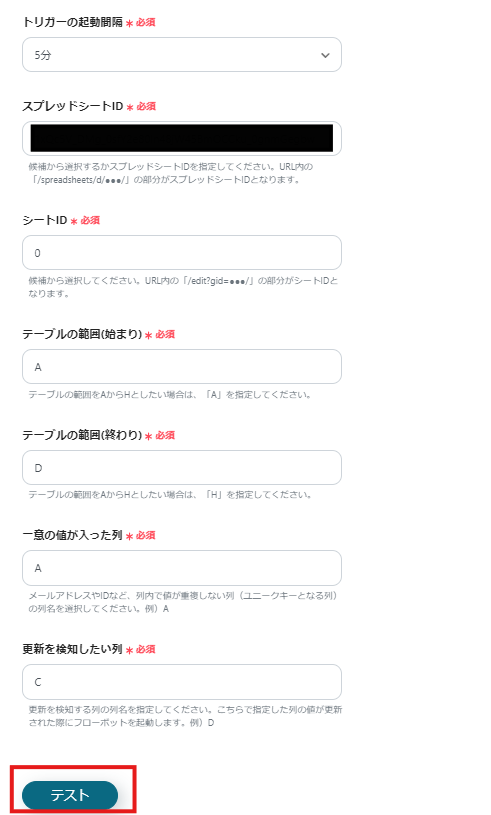 全ての項目が入力できたら「テスト」をクリックして、エラーの有無を確認しましょう。