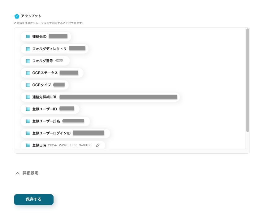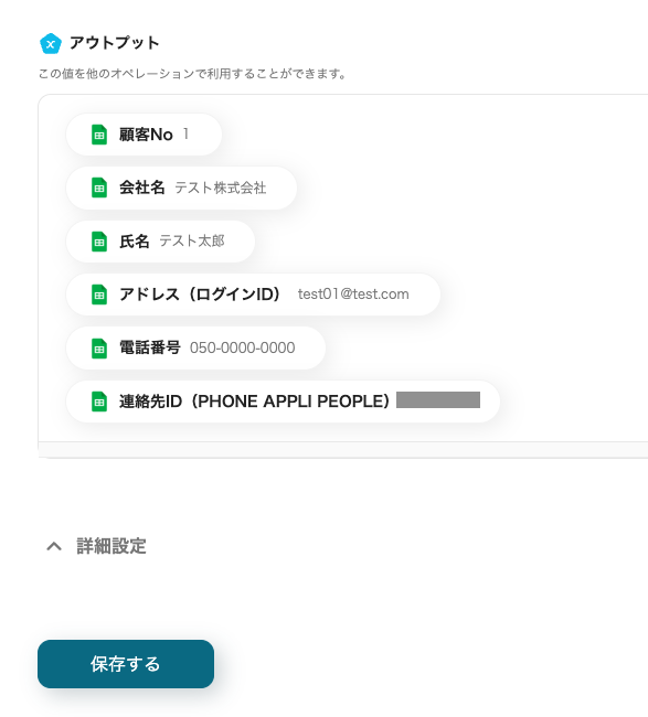 アウトプットにGoogle スプレッドシートから取得した情報が表示されていることを確認し「保存する」をクリックしてください。